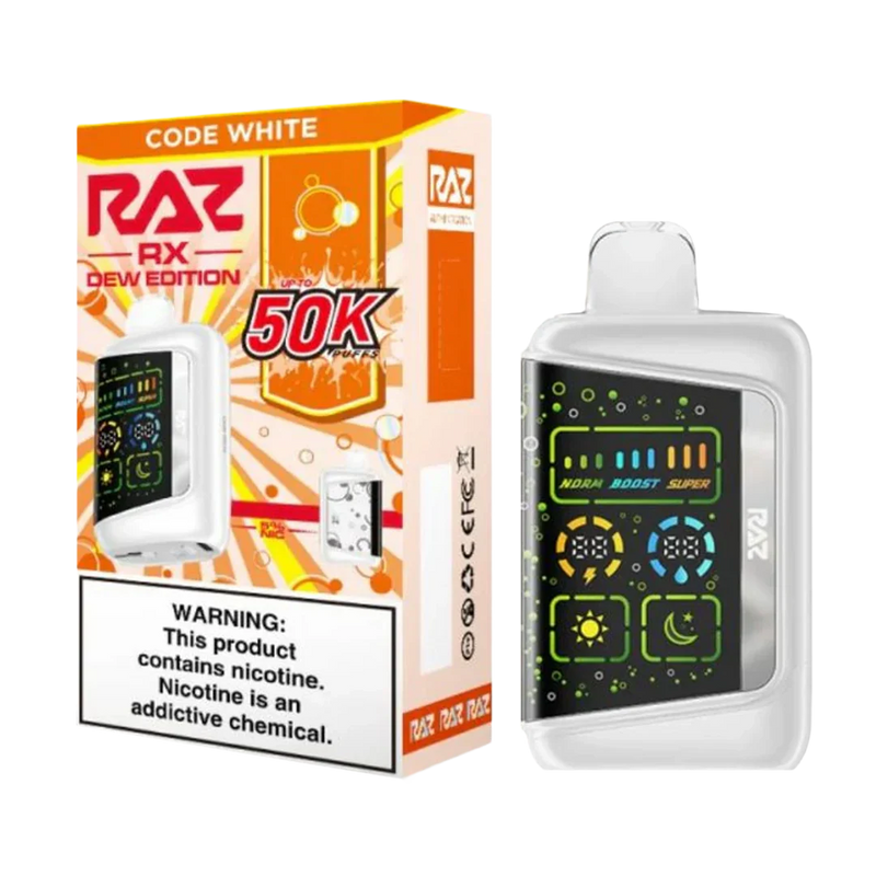 Code White – RAZ RX50K is a high-capacity disposable vape engineered for heavy vapers who want weeks of use, precise flavor, and adjustable contro...